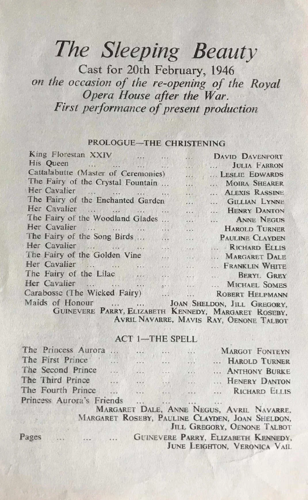 The Gala Performance of The Sleeping Beauty on the evening of 20 February 1946 heralding the re-opening of the Royal Opera House after the war was attended by King George VI and Queen Elizabeth, along with Princesses Elizabeth and Margaret.