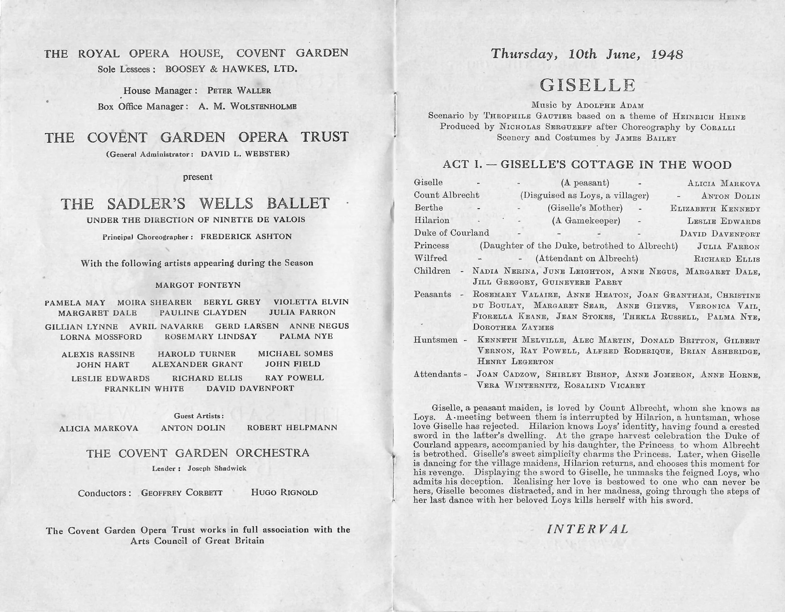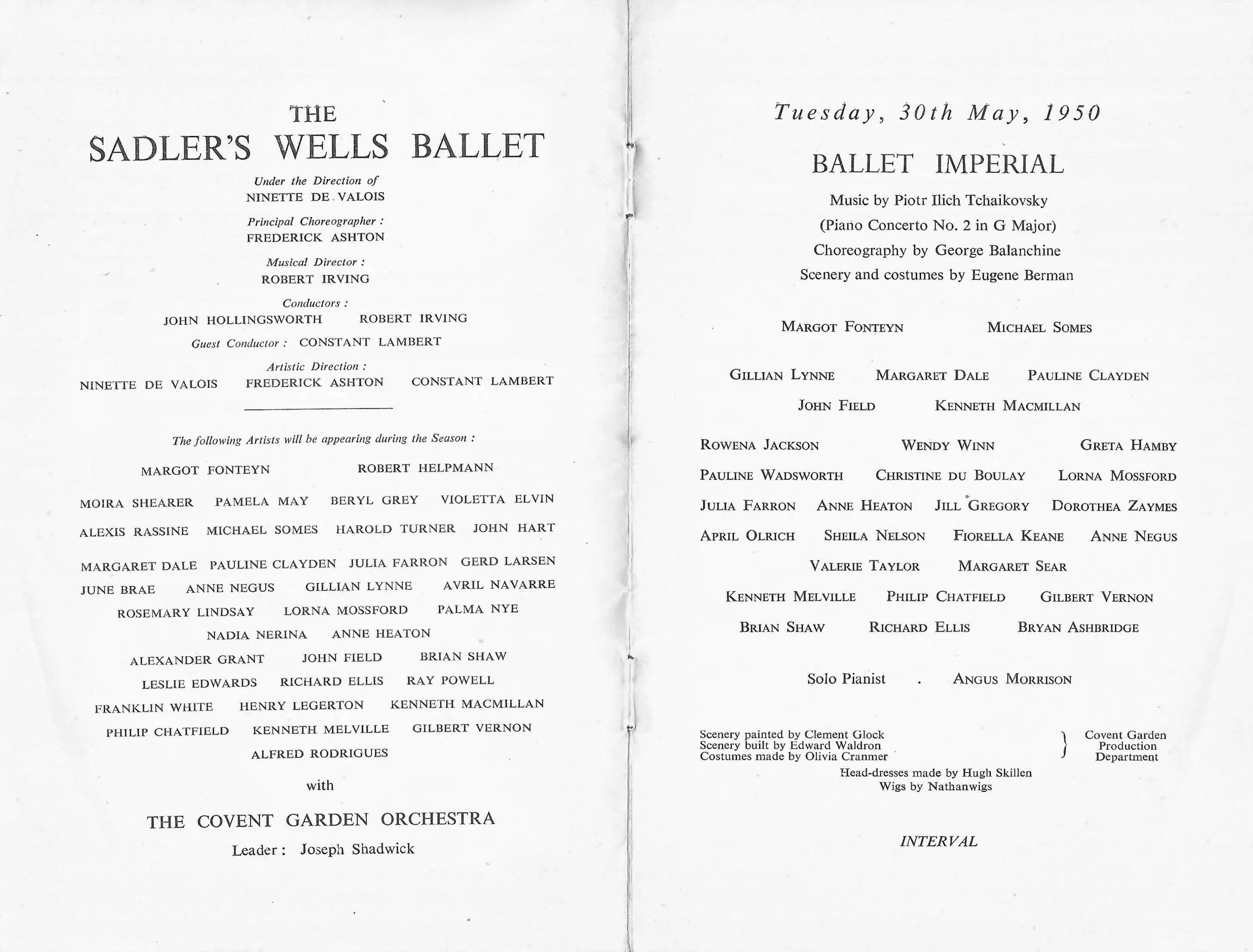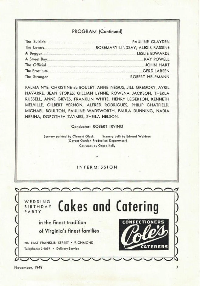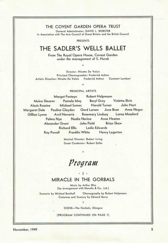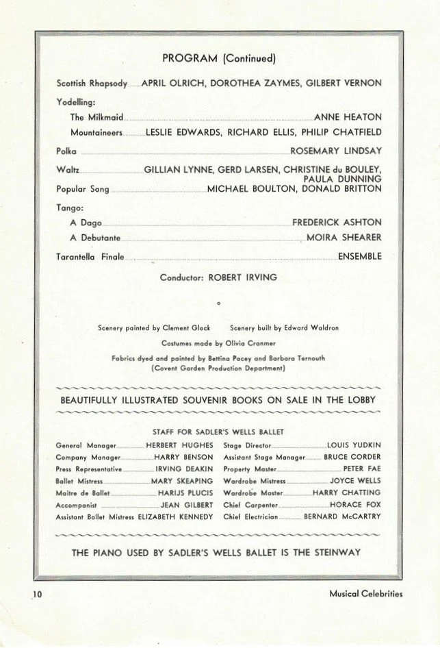 Dancers in this period included Margot Fonteyn, Beryl Grey, Moira Shearer, Julia Farron, Pamela May, Violetta Elvin, Pauline Clayden, Nadia Nerina, Gerd Larsen, June Brae, Palma Nye, Robert Helpmann, Michael Somes, Alexis Rassine, David Paltenghi, Henry Danton - with guest artists including Alicia Markova, Anton Dolin - and many many more…….