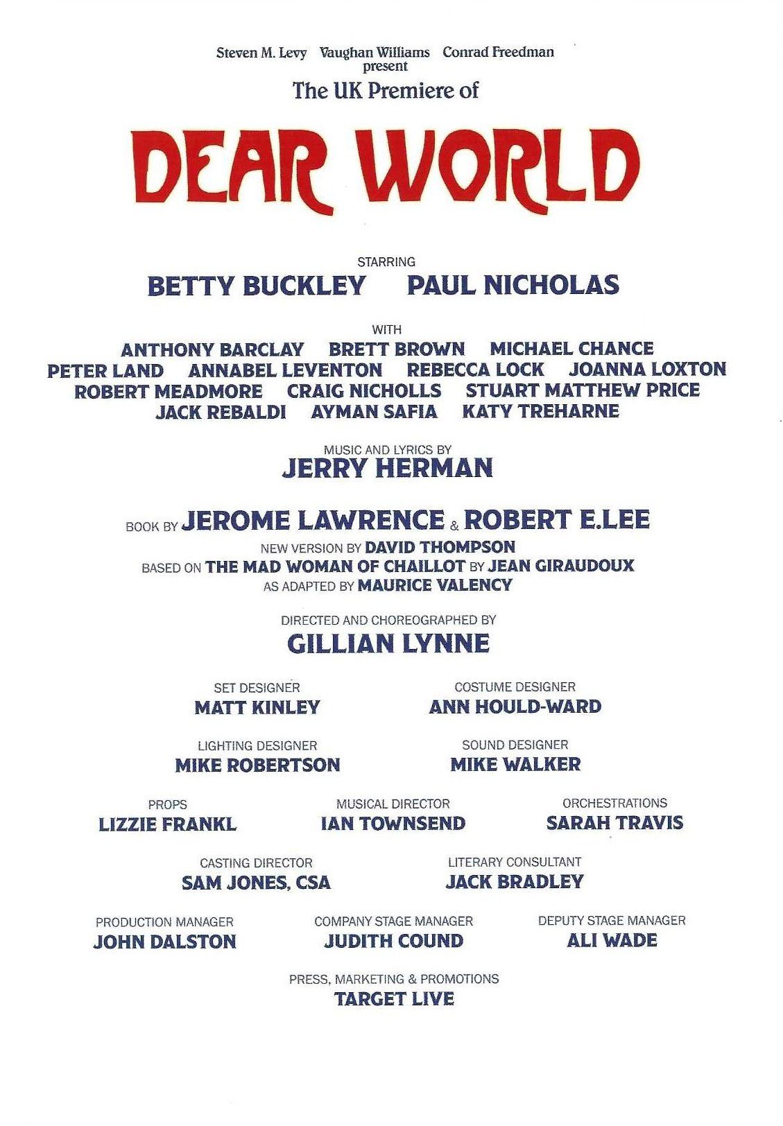 Cast included: Betty Buckley, Paul Nicholas, Peter Land, Stuart Matthew-Price, Anthony Barclay, Annabel Leventon, Jack Rebaldi, Robert Meadmore