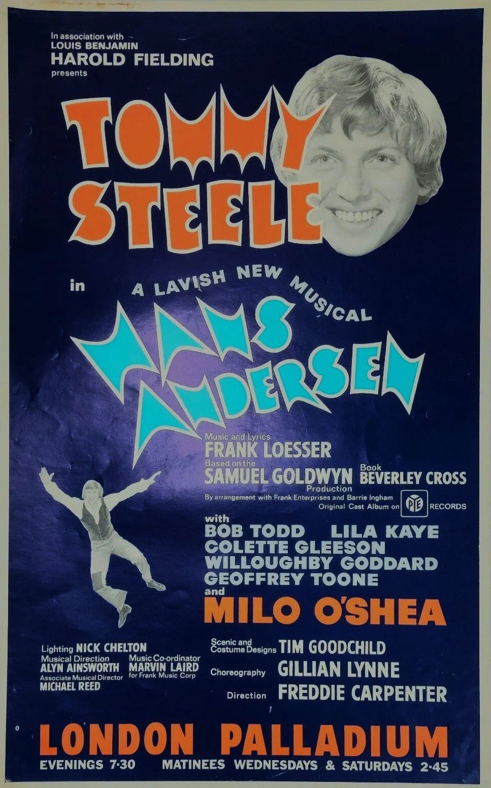 Based on the film of 1954 starring Danny Kaye, Hans Andersen is a musical about the life of the famous Danish poet and story-teller Hans Christian Andersen. It was rewritten for the stage by Beverley Cross with Tommy Steele, music and lyrics by Frank Loesser, and additional songs by Marvin Laird.
