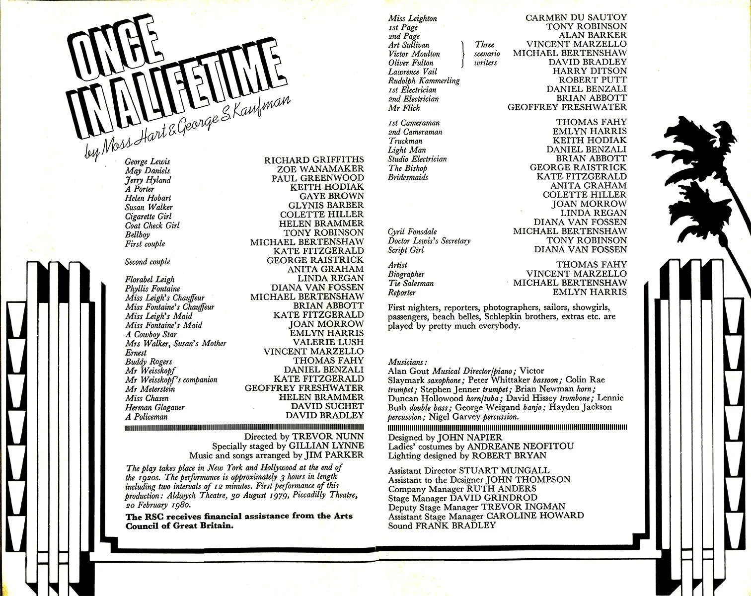 The Royal Shakespeare Company production of the satirical play by Moss Hart and George Kaufman, set in the 1930’s, about the effect talking pictures are having on the entertainment industry, and starred Richard Griffiths as George Lewis, the hopeless wannabe film director, aided by Zoe Wannamaker (Mary Daniels) and Peter McEnery (Jerry Hyland). The production was notable for featuring a fifteen minute tap-dancing finale.