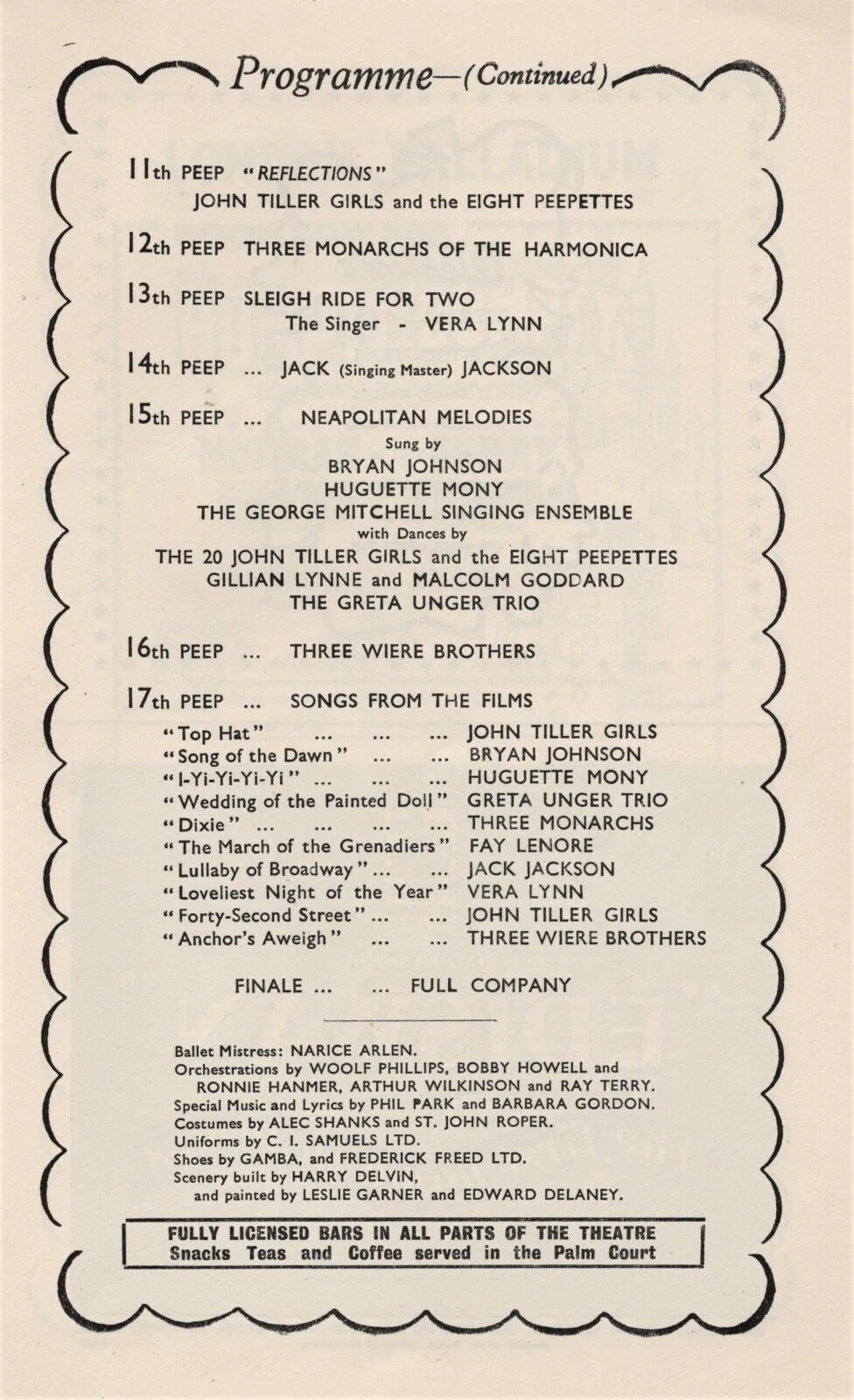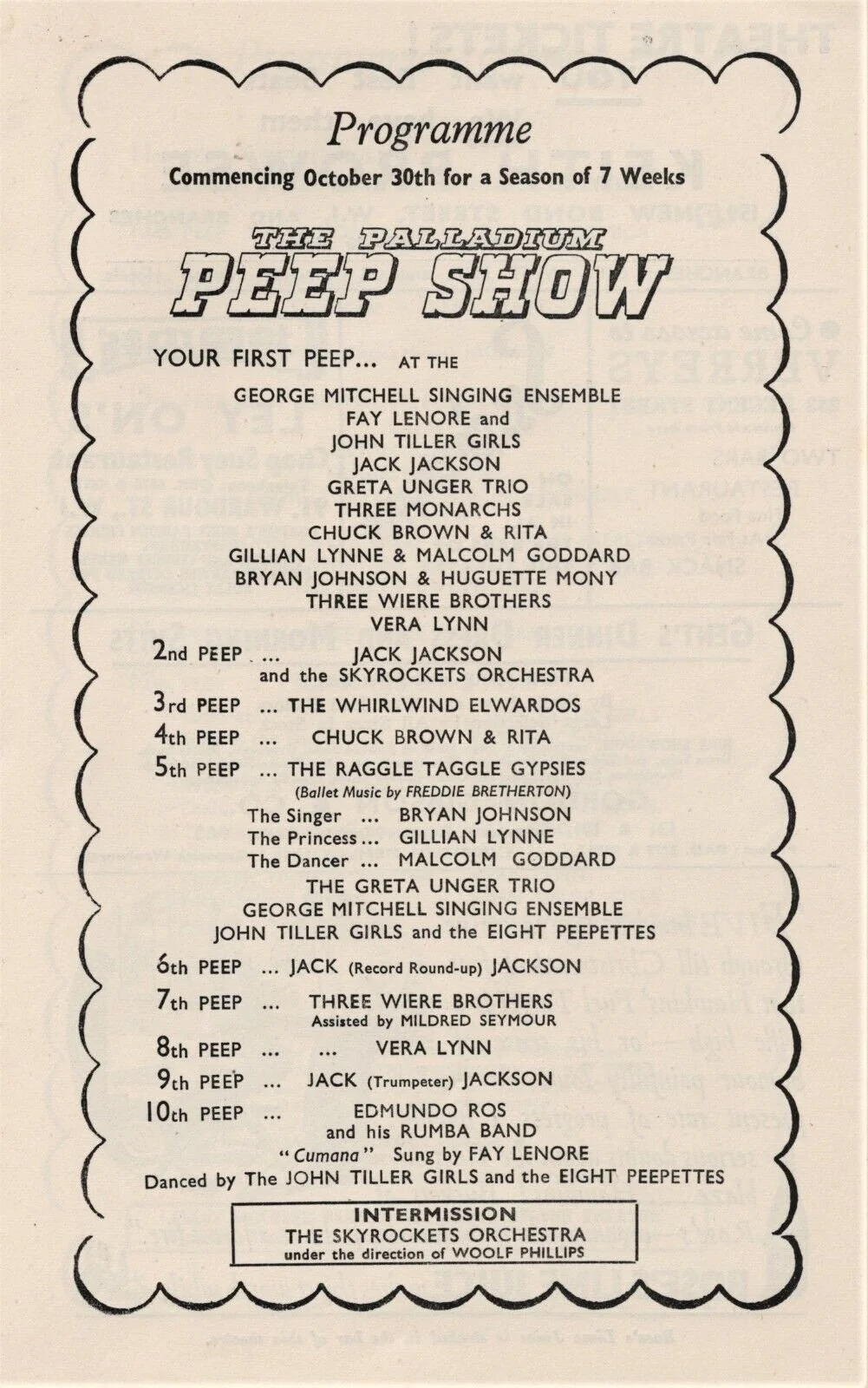 Gillian made the break from Sadler’s Wells Ballet appearing in autumn of 1951 in Val Parnell’s musical production ‘Peep Show’ at the London Palladium alongside Vera Lynn and the Tiller Girls. Also appearing were trumpeter Jack Jackson, the George Mitchell singing ensemble and Edmundo Ros and his band, as well as many other notable acts of the time.