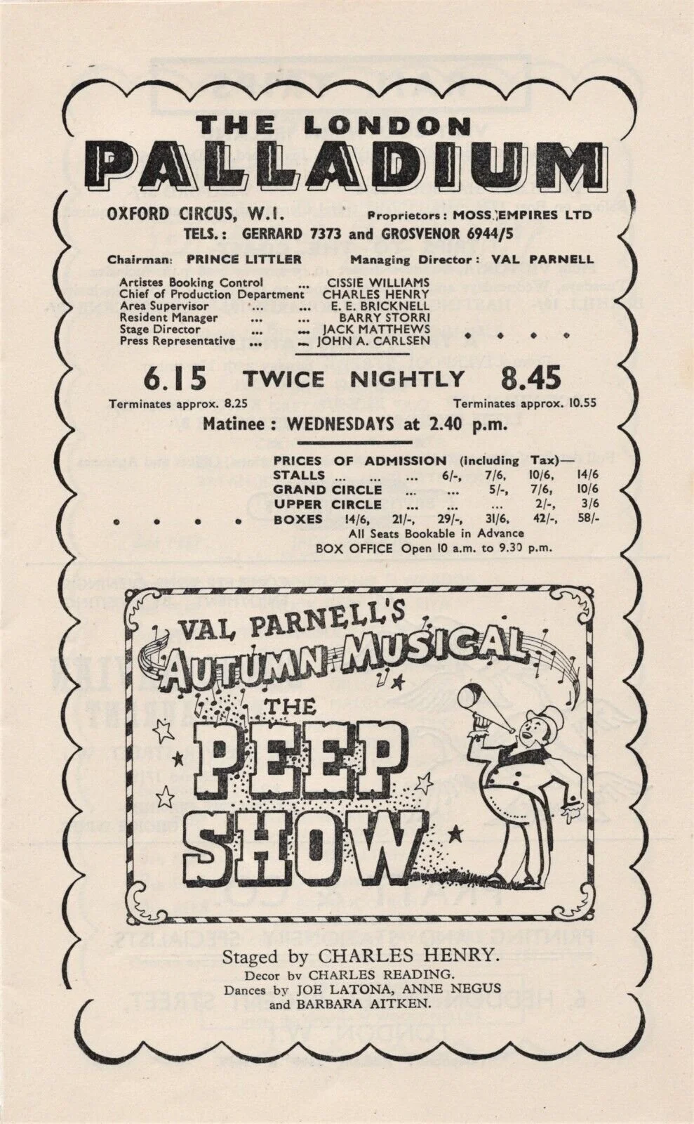 The show ran for seven weeks at the Palladium with two nightly performances as well as matinee shows before transferring to the Prince of Wales Theatre, eventually running for a combined total of 239 performances - the culture shock of exchanging Covent Garden for the Palladium could not have been greater.